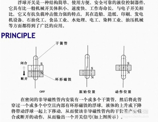 磁性浮子開關同普通型浮子開關一樣,主要是在密閉的金屬或塑膠管內,設計一點或多點的磁簧開關,然后將管子貫穿一個或多個,中空而內部裝有環型磁鐵的浮環,并利用固定環,控制浮球與磁簧開關在相關位置上,使浮子在一定范圍內上下浮動。利用浮子內的磁鐵去吸引磁簧開關的接點,產生開與關的動作,作液位的控制或指示。